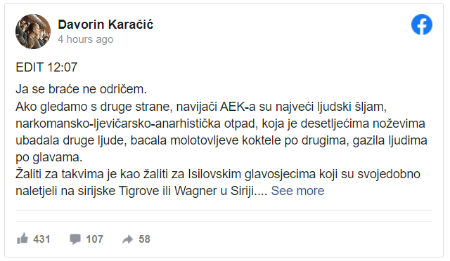 «Δεν εγκαταλείπω αδέρφια. Αν το δούμε από την άλλη, οι οπαδοί της ΑΕΚ είναι τα μεγαλύτερα ανθρώπινα αποβράσματα, ναρκομανή-αριστερά-αναρχικά απόβλητα, που μαχαίρωναν άλλους ανθρώπους για δεκαετίες, πετούσε μολότοφ σε άλλους, ποδοπατούσαν ανθρώπινα κεφάλια. Ένα είναι σίγουρο, ότι τα γεγονότα δεν έγιναν όπως αναφέρουν τα ΜΜΕ. Παρεμπιπτόντως, όλοι οι οπαδοί της Ντινάμο που τραυματίστηκαν από μαχαίρι, φέρουν επιφανειακά τραύματα. Δεν θα με εξέπληττε καθόλου αν ένας αναρχικός χτυπούσε με μαχαίρι με επιθυμία να σφάξει έναν δικό μας. Όλοι ξέρουν ότι οι BBB πάνε παντού. Οι αναρχικοί το ήξεραν αυτό, οπότε τους περίμεναν εκείνο το βράδυ, οπλισμένοι με μαχαίρια. Υπάρχουν ακόμη και πλάνα από αναρχικούς να κάνουν κύκλους στο γήπεδο. Πήραν αυτό που ήθελαν».