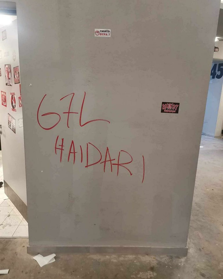 Από την άλλη, οπαδοί του Ολυμπιακού έχουν γεμίσει με αυτοκόλλητα πολλά σημεία του γηπέδου.