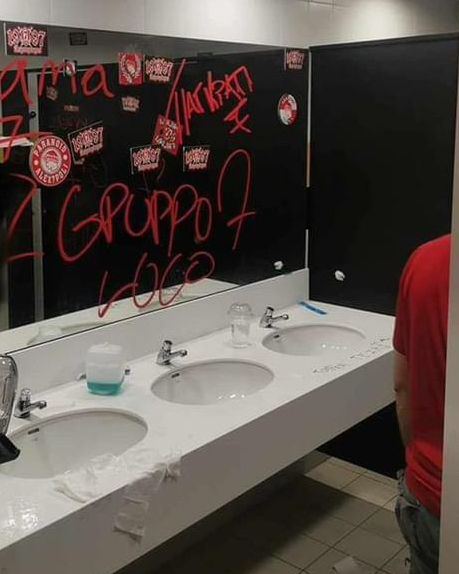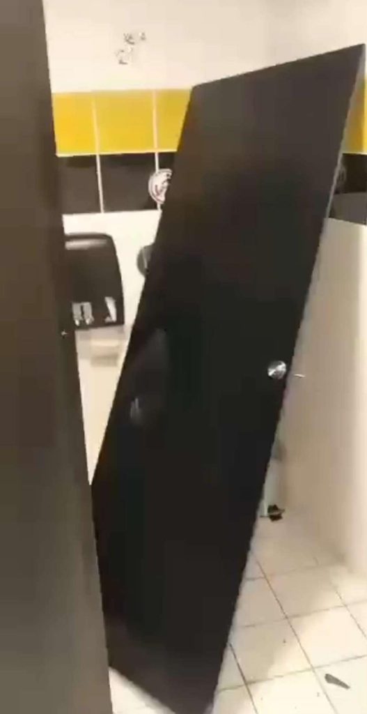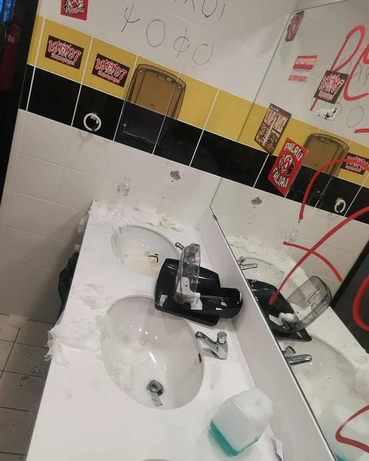 Σε φωτογραφίες που κυκλοφόρησαν στα social media φαίνεται μια πόρτα σπασμένη στις τουαλέτες, ενώ φαίνονται και γραμμένα συνθήματα σε τοίχους και καθρέφτες.