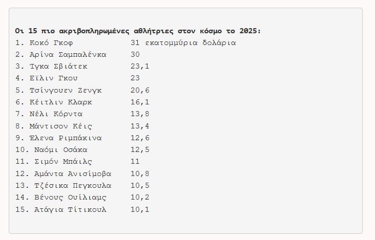 Η σταρ του τένις Κοκό Γκοφ ηγείται για τρίτη συνεχόμενη χρονιά με 31 εκατομμύρια δολάρια, ένα βήμα μπροστά από την αντίπαλό της Αρίνα Σαμπαλένκα (30 εκατομμύρια δολάρια), της κατάταξης με τις 15 πιο ακριβοπληρωμένες γυναίκες στον κόσμο το 2025, που παρουσίασε η εξειδικευμένη ιστοσελίδα sportico.