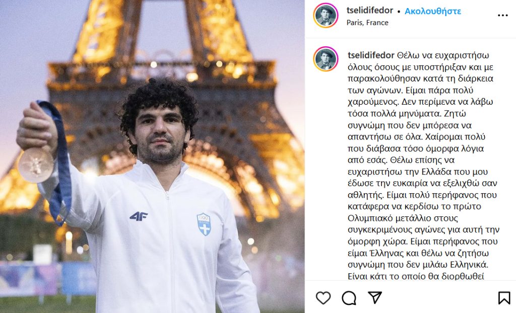 Σήμερα (3/8), ο τζουντόκα, με ανάρτησή του στον προσωπικό λογαριασμό του στο “Instagram” θέλησε να ευχαριστήσει όλους όσοι τον έχουν βοηθήσει για να φθάσει σε αυτή την μεγάλη επιτυχία. «Υπερήφανος που είμαι Έλληνας και θέλω να ζητήσω συγγνώμη που δεν μιλάω ελληνικά,» έγραψε ο «χάλκινος» Ολυμπιονίκης στο τζούντο.