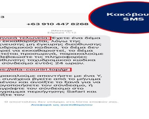 Η ΑΑΔΕ ενημερώνει ότι το τελευταίο διάστημα παρατηρείται έξαρση αποστολής παραπλανητικών SMS, τα οποία αποστέλλονται από επιτήδειους, που εμφανίζονται ως «Ελληνικά Τελωνεία». Τα μηνύματα αυτά, με την πρόφαση της εκκαθάρισης δέματος, ζητούν από τους παραλήπτες να πατήσουν σε σύνδεσμο (link) για να