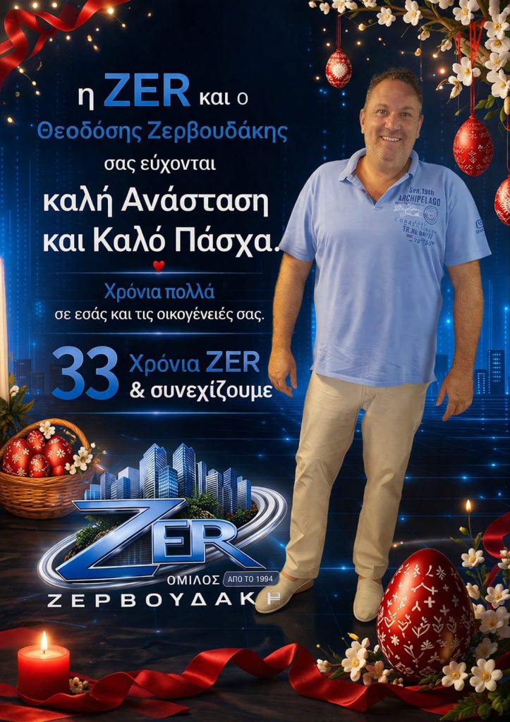 Ο Θεοδόσης Ζερβουδάκης, πρόεδρος του Ομίλου ZER έστειλε τις θερμές ευχές του για Καλή Ανάσταση και Καλό Πάσχα προς όλους.