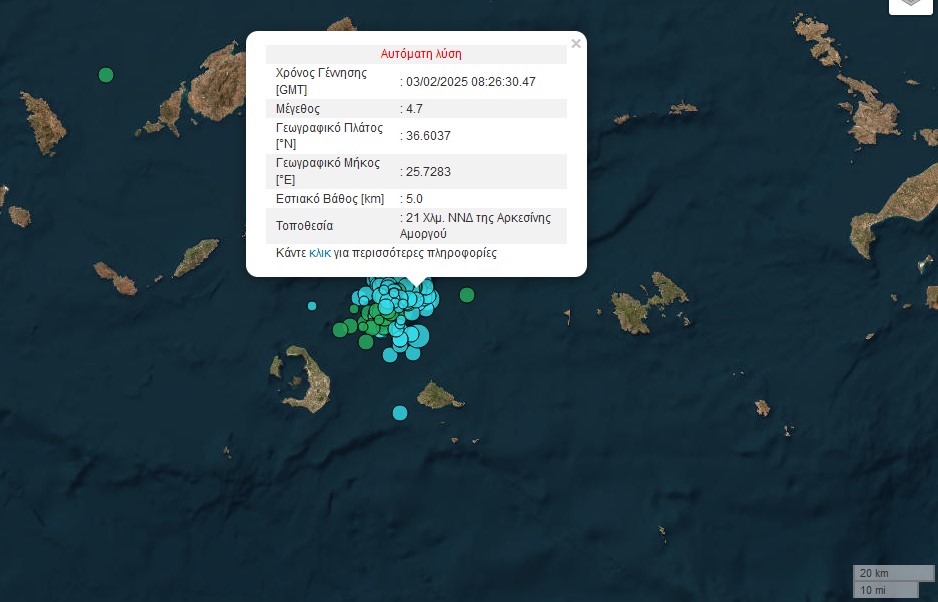 Ο τελευταίος σημειώθηκε στις 11:29 και είχε μέγεθος 4,9 Ρίχτερ με εστιακό βάθος 16,4 χλμ και επίκεντρο 25χλμ ΝΝΔ της Αρκεσίνης Αμοργού.