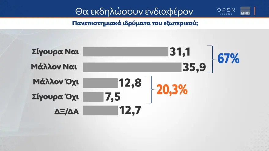 Στην ερώτηση για το αν πιστεύουν ότι θα εκδηλώσουν ενδιαφέρον μεγάλα πανεπιστημιακά ιδρύματα του εξωτερικού, το 67,1% απαντά «σίγουρα ναι» ή «μάλλον ναι», ενώ το 20,3% απαντά «σίγουρα όχι» ή «μάλλον όχι».