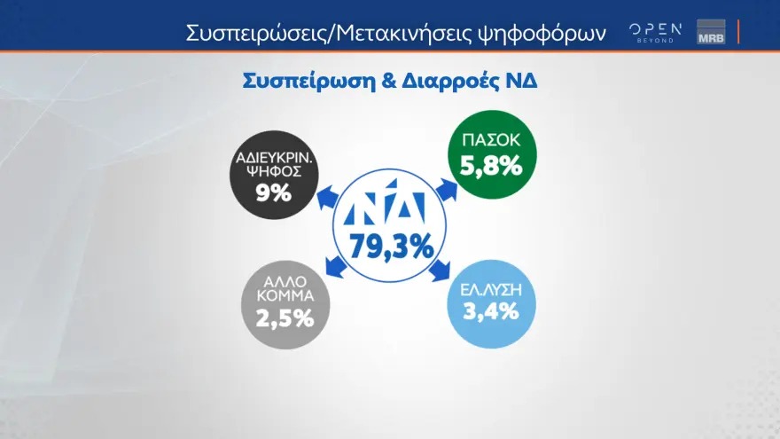 Σύμφωνα με τη δημοσκόπηση της MRB, η ΝΔ καταγράφει συσπείρωση 79,3% και έχει διαρροές 5,8% προς το ΠΑΣΟΚ, 3,4% προς την Ελληνική Λύση, 9% είναι αδιευκρίνιστη ψήφος και 2,5% προς άλλο κόμμα.