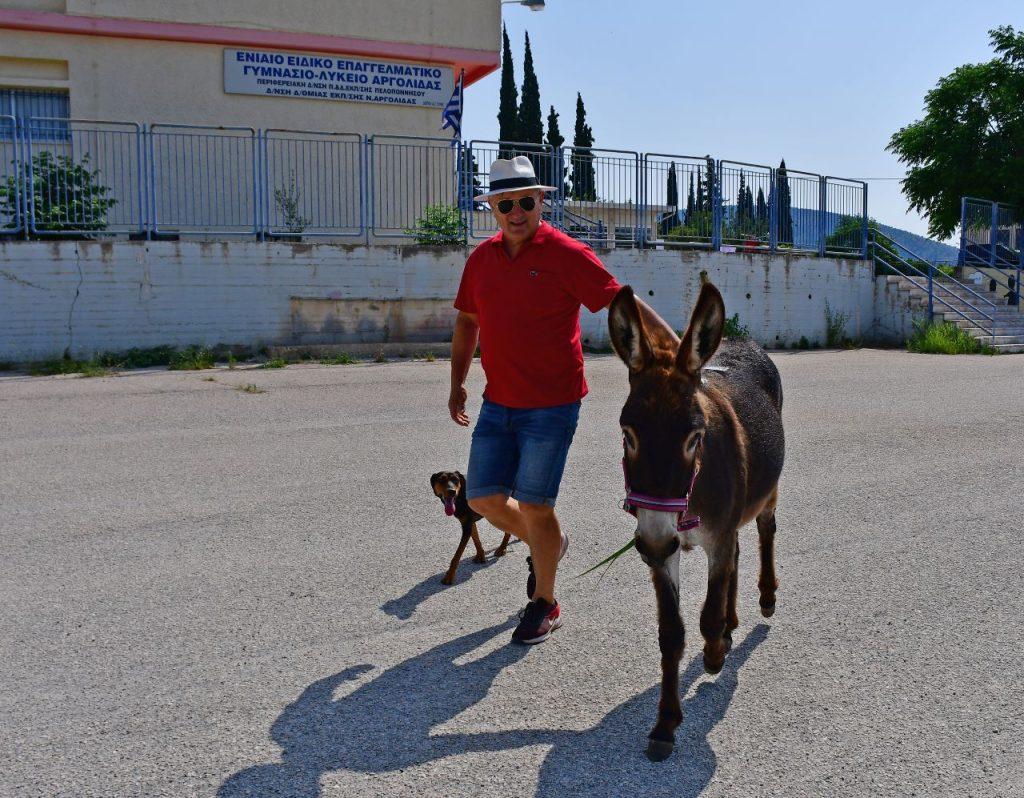 Σε εκλογικό τμήμα του Ειδικού Γυμνασίου Λυκείου Αργολίδας, ένας πολίτης πήγε να ψηφίσει παρέα με έναν γάιδαρο.
