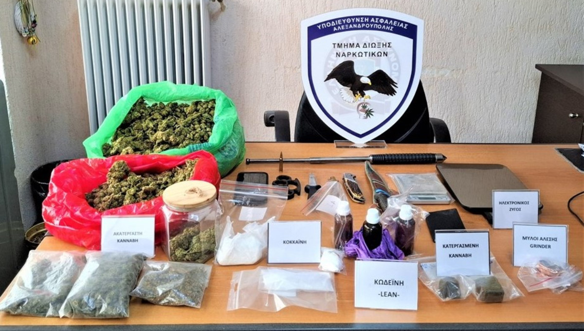 Ειδικότερα, έπειτα από κατάλληλη αξιοποίηση πληροφοριών σχετικά με ημεδαπό που δραστηριοποιείται στη διακίνηση ναρκωτικών ουσιών στην ευρύτερη περιοχή του Έβρου οι αστυνομικοί συνέλαβαν τον δράστη διότι σε έρευνες που πραγματοποίησαν σε δύο οικίες με τη συνδρομή αστυνομικού σκύλου ανίχνευσης ναρκωτικών «LAIKA» εντόπισαν νάιλον συσκευασίες με κοκαΐνη συνολικού βάρους 114,8 γραμμαρίων, δύο νάιλον συσκευασίες με κατεργασμένη κάνναβη (σοκολάτα), συνολικού βάρους 53,1 γραμμαρίων, ένα γυάλινο βάζο και πέντε νάιλον συσκευασίες με ακατέργαστη κάνναβη συνολικού βάρους ενός κιλού και 486,9 γραμμαρίων, όπως και δύο ηλεκτρονικές ζυγαριές ακριβείας, μεταλλικός τρίφτης, τρία γυάλινα φιαλίδια με ναρκωτική ουσία «lean» συνολικού όγκου 110 ml, μια μεταλλική ράβδο, μια σιδερογροθιά και τέσσερα μαχαίρια.