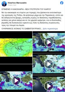 «Με την κακοκαιρία να επιμένει για περιοχές που βρίσκονται ανατολικότερα της οροσειράς της Πίνδου, θα φτάσουμε μέχρι και την Παρασκευή, οπότε και θα εκδηλώνονται βροχές, καταιγίδες κυρίως σε θαλάσσιες παραθαλάσσιες εκτάσεις και χιόνια ακόμη και σε πιο χαμηλά υψόμετρα, ενώ οι θυελλώδεις βοριάδες θα δυσκολεύουν αρκετά έως πολύ τις θαλάσσιες συγκοινωνίες προς την πλευρά του Αιγαίο.