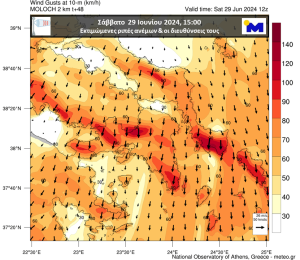 Συγκεκριμένα, σύμφωνα με τα προγνωστικά στοιχεία του Εθνικού Αστεροσκοπείου Αθηνών / Meteo.gr, οι ριπές των ανέμων στην Ανατολική Στερεά και στην Εύβοια τις μεσημεριανές ώρες του Σαββάτου 29/06 τοπικά θα φτάσουν τα 90 km/h, ενώ στη Νότια Εύβοια και σε περιοχές που γειτνιάζουν με έντονη τοπογραφία τα 100 km/h, όπως ευδιάκριτα αποτυπώνεται στον παρακάτω χάρτη.