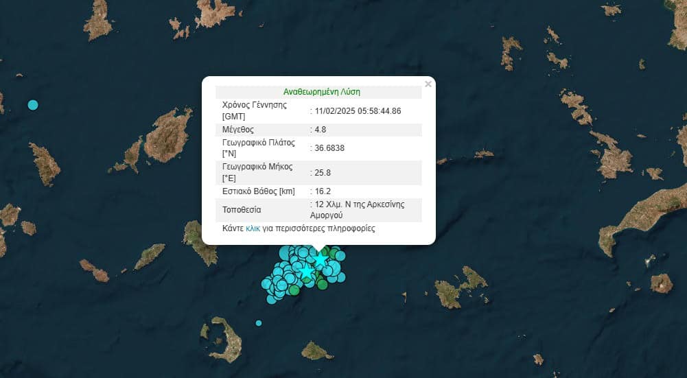 Ειδικότερα, σύμφωνα με το Γεωδυναμικό Ινστιτούτο του Εθνικού Αστεροσκοπείου Αθηνών, ο σεισμός που σημειώθηκε στις 07:58 το πρωί, είχε ένταση 4,8 βαθμών της κλίμακας Ρίχτερ. Το επίκεντρο της σεισμικής δόνησης εντοπίστηκε 12 χιλιόμετρα νότια της Αρκεσίνης Αμοργού, ενώ το εστιακό βάθος υπολογίζεται στα 16,2 χιλιόμετρα.