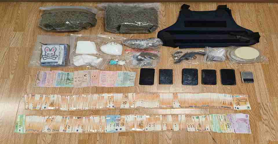 Ναρκωτικά: 2.153 γραμμάρια κοκαΐνης, 2.135 γραμμάρια ακατέργαστης κάνναβης και 131 γραμμάρια κατεργασμένης κάνναβης («σοκολάτα»).