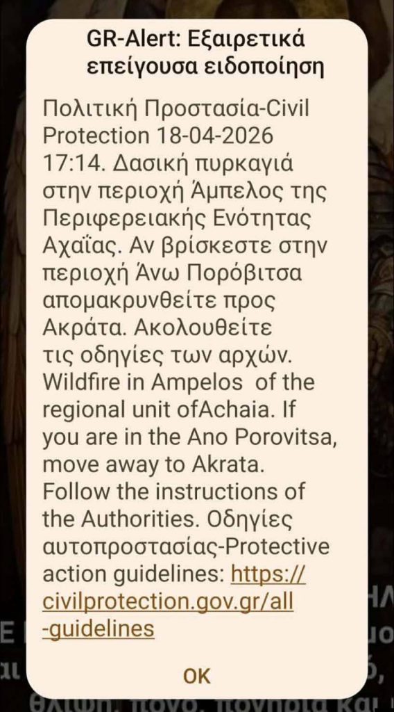 Μάλιστα, λίγο μετά τις 17.30 εστάλη μήνυμα από το 112 σε όσους βρίσκονται στην περιοχή Άνω Πορόβιτσα να απομακρυνθούν προς Ακράτα.