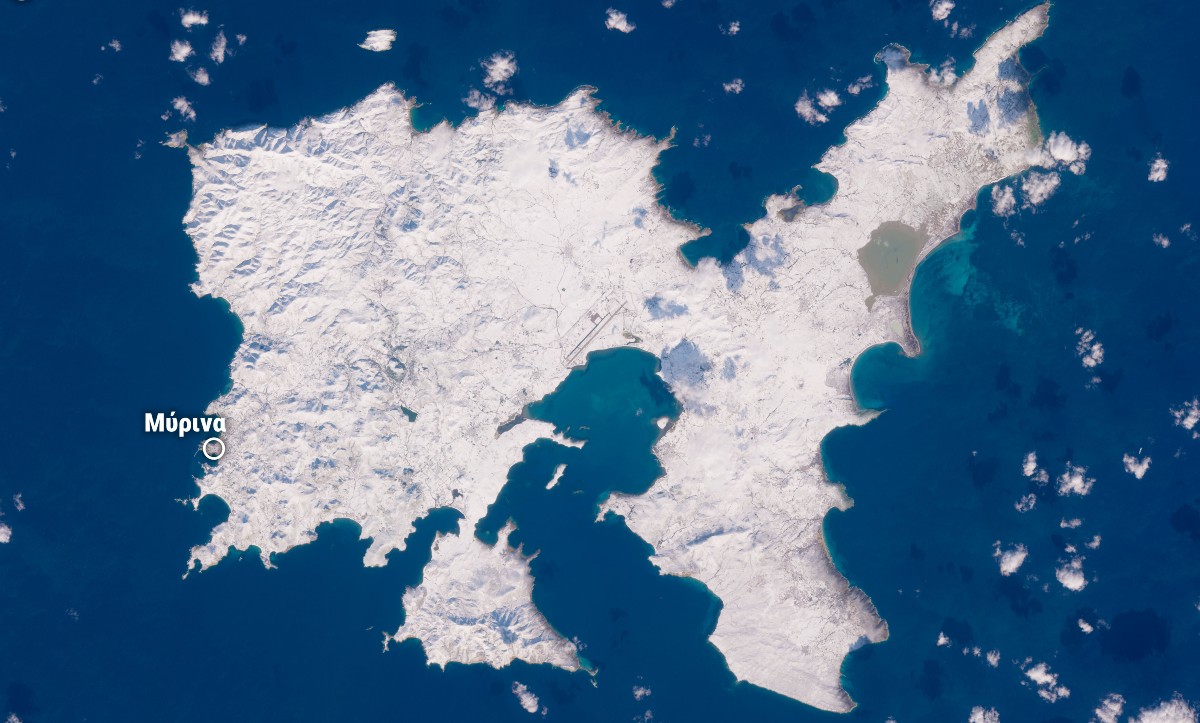 Η δορυφορική εικόνα, που ελήφθη από τον ευρωπαϊκό δορυφόρο Sentinel-2 το μεσημέρι της Πέμπτης 1 Ιανουαρίου 2026, αποτυπώνει την εντυπωσιακή εικόνα της κατάλευκης Λήμνου, η οποία θυμίζει σκηνές από τον Αρκτικό Κύκλο καθώς επικράτησε χιονοκάλυψη στο 100% του νησιού.