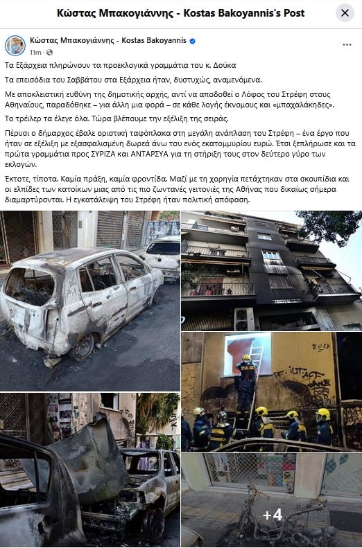Με ανάρτησή του στο facebook, ο Κώστας Μπακογιάννης αναφέρθηκε στα επεισόδια που έγιναν το Σάββατο το βράδυ στα Εξάρχεια, αποδίδοντας πλήρως την ευθύνη στη δημοτική αρχή και τον Δήμαρχο Αθηναίων Χάρη Δούκα.