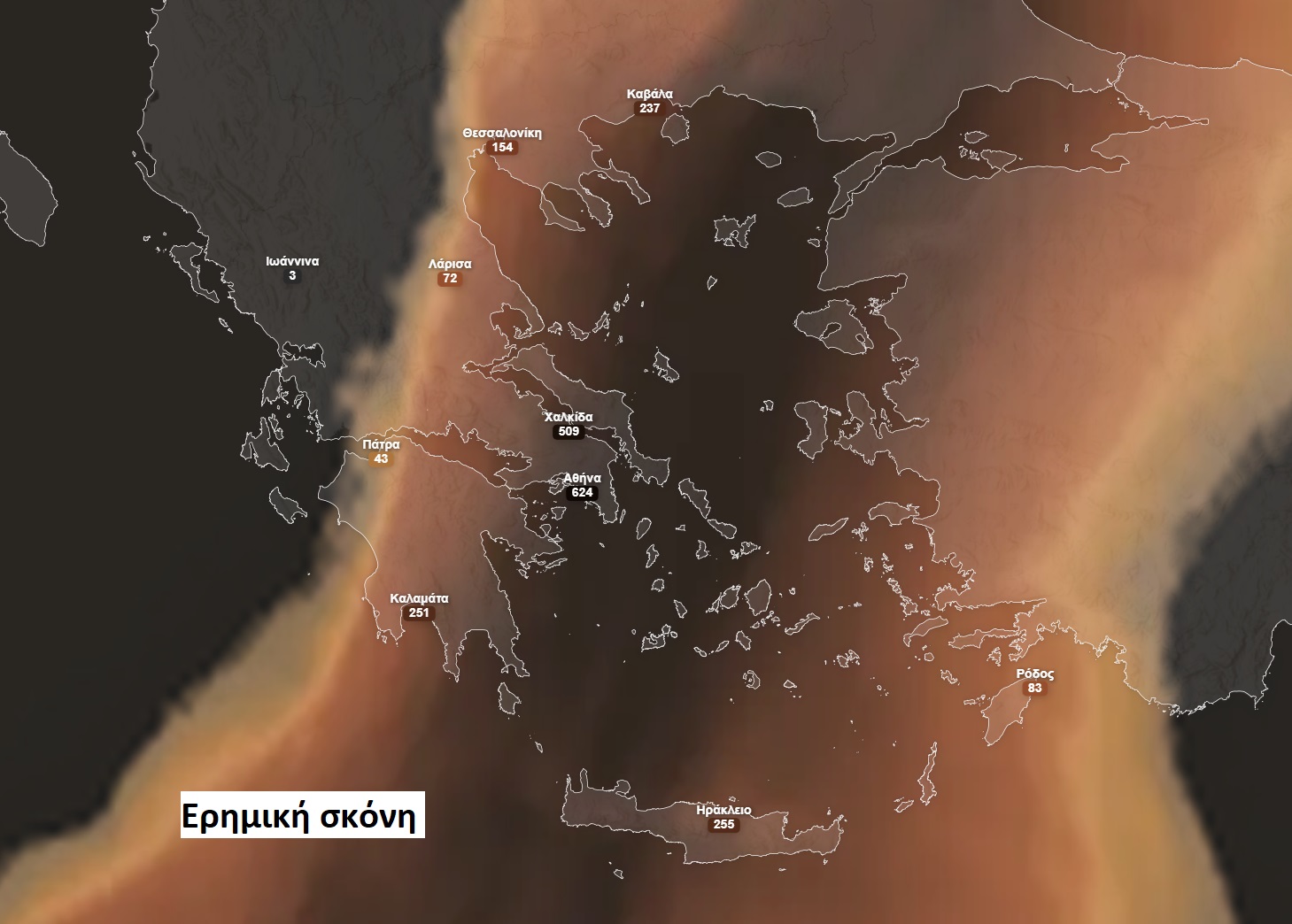 Στον δεύτερο χάρτη αποτυπώνεται η ποσότητα της ερημικής σκόνης που μεταφέρεται στην ατμόσφαιρα. Εδώ η μονάδα είναι διαφορετική και αφορά τη μάζα σωματιδίων σε mg ανά επιφάνεια, επομένως δείχνει το φορτίο του φαινομένου και όχι άμεσα τι αναπνέουμε στο επίπεδο της πόλης.
