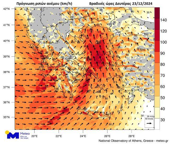 Όπως φαίνεται, άνεμοι δυτικών διευθύνσεων με ριπές 90-100 km/h θα πνέουν στη Δυτική Ελλάδα και άνεμοι νοτίων διευθύνσεων με ριπές 90-100 km/h στο Αιγαίο.