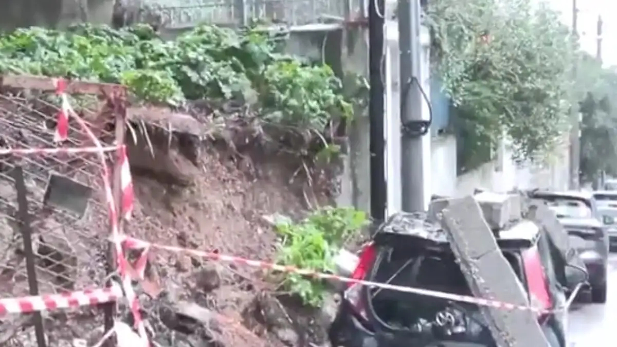 Ο μαντρότοιχος οικοπέδου στην Βουλιαγμένη υποχώρησε εξαιτίας της τεράστιας έντασης νερού από την κακοκαιρία Byron και προσγειώθηκε στο παρκαρισμένο αυτοκίνητο, το οποίο κατέστρεψε.