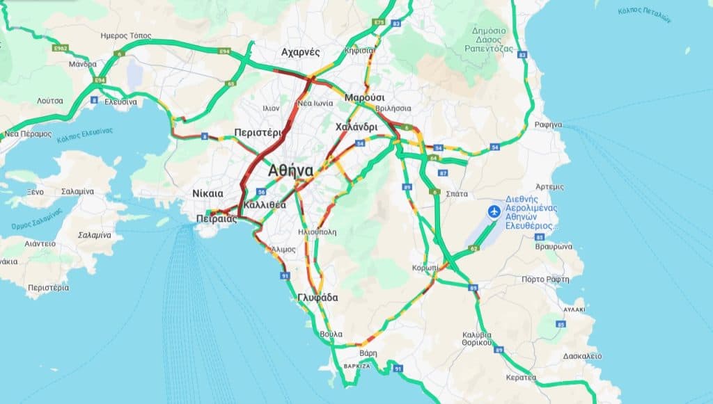 Στο «κόκκινο» οι δρόμοι και γύρω από το λιμάνι του Πειραιά, το κέντρο της Αθήνας και η Ποσειδώνος στο ρεύμα προς Πειραιά, από τον Άγιο Κοσμά μέχρι την Καλλιθέα.