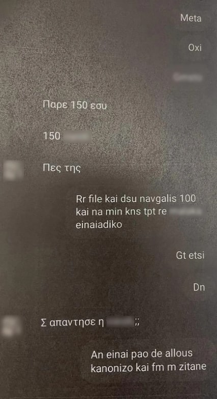 «Πάρε 150 εσύ, 150 (αναφέρεται σε όνομα) πες της», με το πρόσωπο στην άλλη άκρη της εφαρμογής να άπαντα πως «ρε φίλε κι εσύ να βγάλεις 100 και να μην κάνεις τίποτα ρε μ@@@ είναι άδικο γιατί έτσι…».