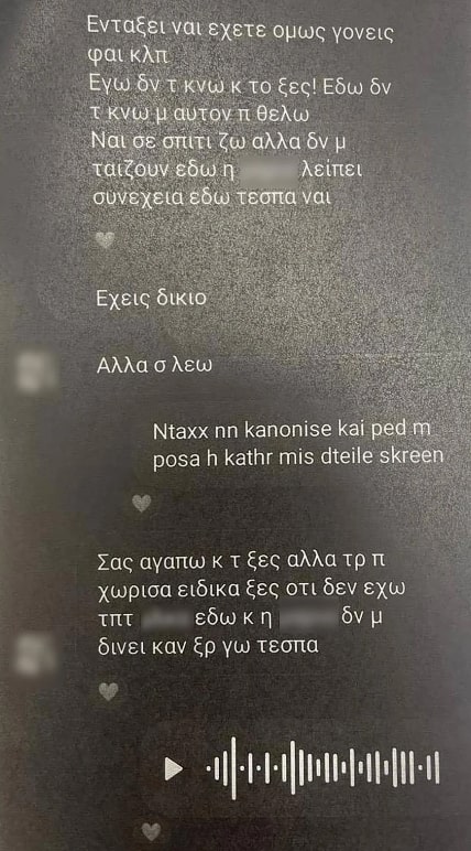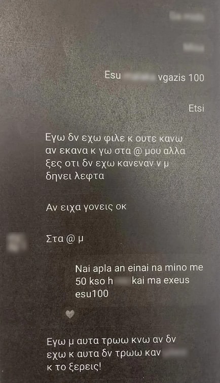 «Εντάξει ναι έχετε όμως γονείς φαΐ και λοιπά. Εγώ δεν το κάνω και το ξέρεις. Εδώ δεν τον κάνουμε αυτόν που θέλω. Ναι σε σπίτι ζω αλλά δε με ταΐζουν εδώ η Μαρία λείπει συνέχεια εδώ. Έχεις δίκιο αλλά σου λέω…», αναφέρεται σε άλλη, με το θύμα απαντάει «εντάξει κανόνισε πόσα η καθεμία και στείλε screen».