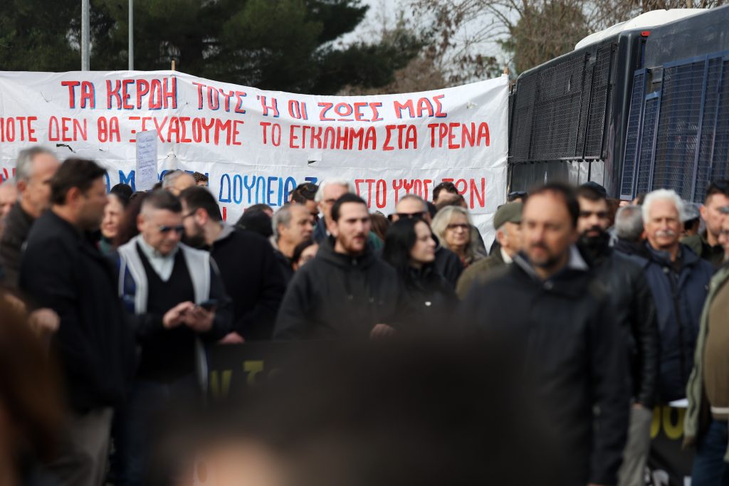 Κόσμος συγκεντρώθηκε από το πρωί στον χώρο του ΓΑΙΟΠΟΛΙΣ στη Λάρισα, όπου διεξάγεται η δίκη για το σιδηροδρομικό δυστύχημα των Τεμπών, συμμετέχοντας σε συγκέντρωση διαμαρτυρίας.