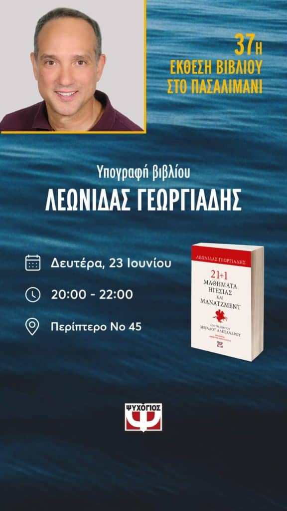 Στις 23 Ιουνίου, στο διάστημα 20:00-22:00, ο Λεωνίδας Γεωργιάδης θα είναι παρών στην 37η Έκθεση Βιβλίου στο Πασαλιμάνι, στο περίπτερο 45, όπου θα έχει την ευκαιρία να συνομιλήσει με τους αναγνώστες του και να υπογράψει το νέο βιβλίο του «21+1 Μαθήματα Ηγεσίας και Μάνατζμεντ από τη ζωή του Μεγάλου Αλεξάνδρου».