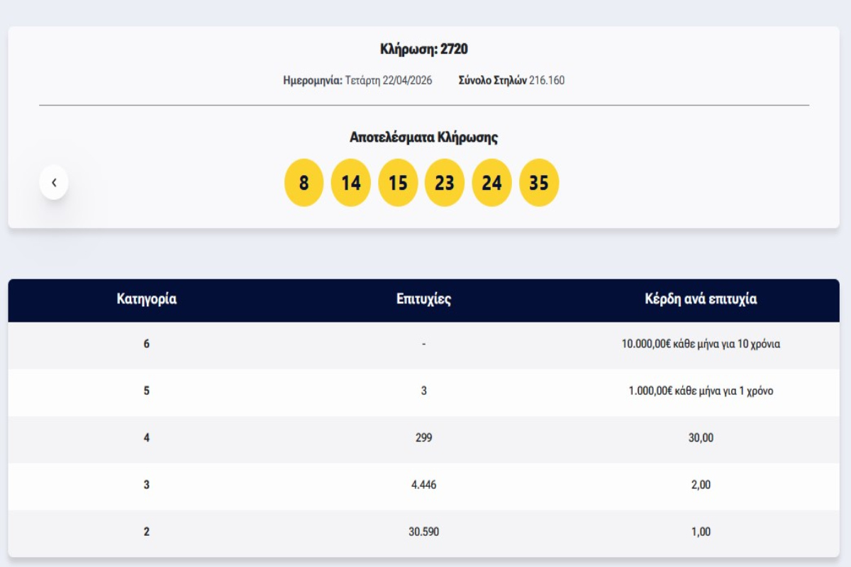 Η κλήρωση 2720 του ΛΟΤΤΟ πραγματοποιήθηκε σήμερα, 22/04/2026 και οι τυχεροί αριθμοί που κληρώθηκαν είναι οι: 8, 14, 15, 23, 24, 35.