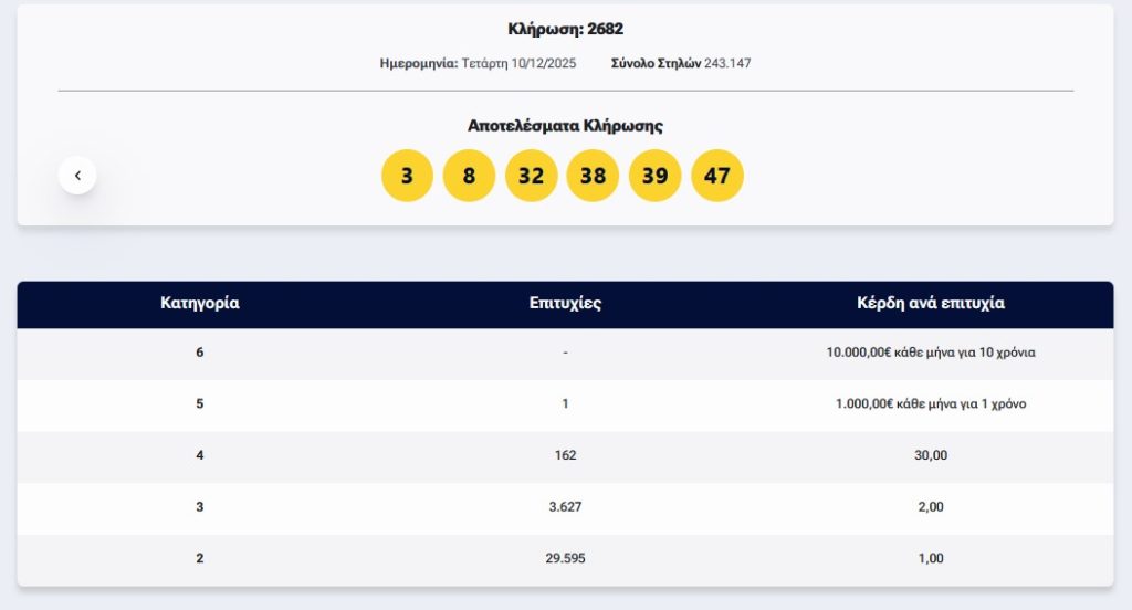 Ολοκληρώθηκε η αποψινή (10.12.2025) κλήρωση (υπ. αριθμ. 2682) του ΛΟΤΤΟ του ΟΠΑΠ.