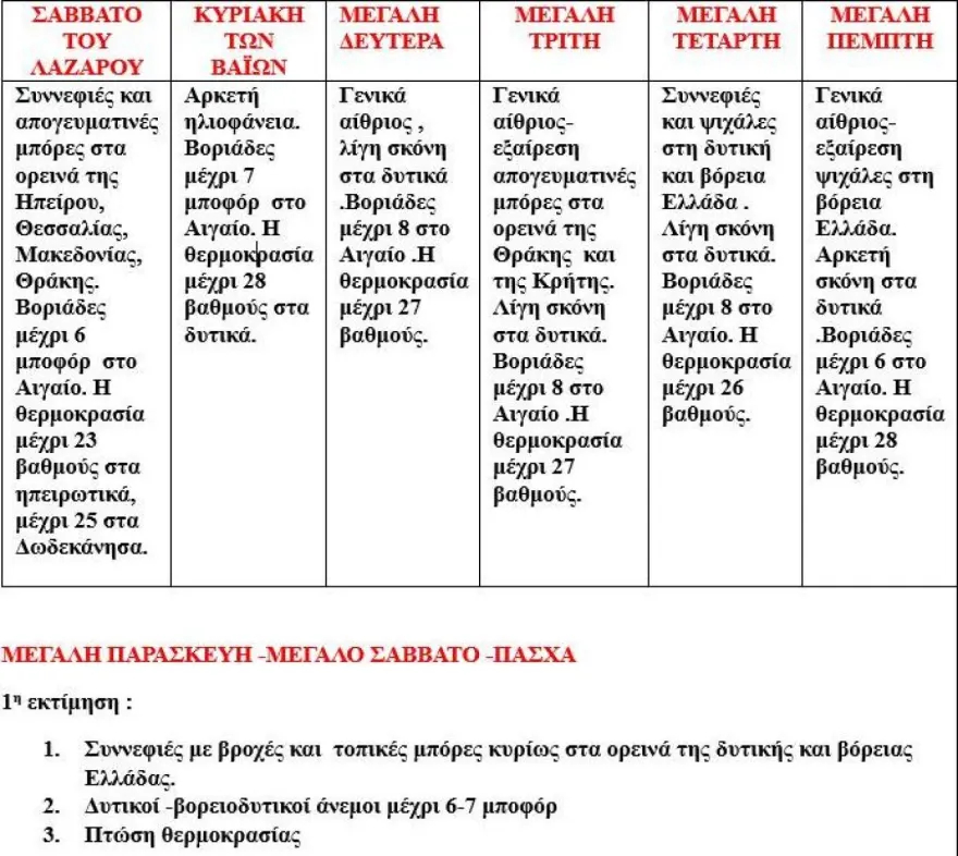 – Μεγάλη Τρίτη: Γενικά αίθριος με εξαίρεση απογευματινές μπόρες στα ορεινά της Θράκης και της Κρήτης. Λίγη σκόνη στα δυτικά. Βορειάδες μέχρι 8 μποφόρ στο Αιγαίο. Η θερμοκρασία μέχρι 27 βαθμούς