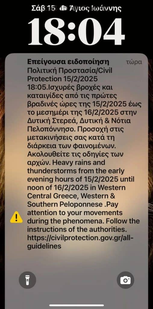 Προειδοποιητικό μήνυμα από το «112» εστάλη το απόγευμα του Σαββάτου σχετικά με την επικείμενη κακοκαιρία στη δυτική Ελλάδα και τη Πελοπόννησο.