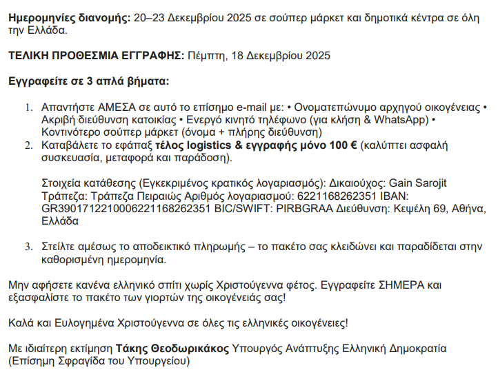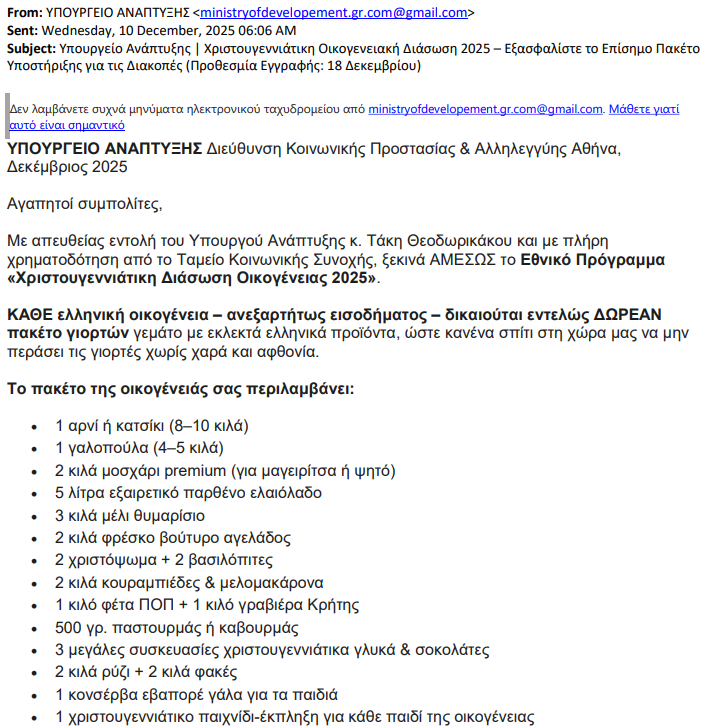 Ακόμη ένα παραπλανητικό e-mail εντοπίστηκε να διακινείται τις τελευταίες μέρες, αυτή τη φορά έχοντας τη μορφή δήθεν κρατικού προγράμματος που υπόσχεται δωρεάν γιορτινό πακέτο από το Υπουργείο Ανάπτυξης με τον τίτλο «Χριστουγεννιάτικη Διάσωση Οικογένειας 2025».