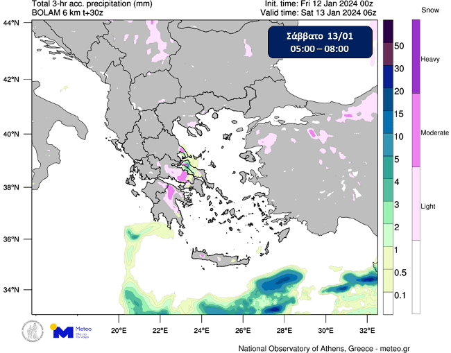 Το Σάββατο 13/01, το κύριο χαρακτηριστικό του καιρού θα είναι οι χιονοπτώσεις σε περιοχές της ανατολικής χώρας με χαμηλό υψόμετρο. Συγκεκριμένα, από τα μεσάνυχτα έως τις πρωινές ώρες του Σαββάτου 13/01 αναμένονται χιονοπτώσεις σε περιοχές με χαμηλό υψόμετρο της Χαλκιδικής, της Θεσσαλίας (Μαγνησία), της Κεντρικής Στερεάς (Ευρυτανία, Φθιώτιδα, Φωκίδα και αργότερα Βοιωτία), καθώς επίσης στα ορεινά και ημιορεινά της Εύβοιας, της Ανατολικής Στερεάς και της Ανατολικής Πελοποννήσου. Οι χιονοπτώσεις στη Μαγνησία και πιθανόν στην Κεντρική Στερεά κατά τόπους θα είναι πυκνές. Τα φαινόμενα βαθμιαία θα εξασθενήσουν και μετά το μεσημέρι θα σταματήσουν.