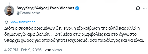 Ο Βαγγέλης Βλάχος, που έχασε τον αδελφό του Βάιο, στο δυστύχημα των Τεμπών, έσπευσε να σχολιάσει δηκτικά κάτω από την ανάρτηση Πλακιά «καρφώνοντας» την Καρυστιανού: «Διότι ο σκοπός ορισμένων δεν είναι η εξακρίβωση της αλήθειας αλλά η δημιουργία αμφιβολιών. Γιατί μέσα στις αμφιβολίες και στο άγνωστο υπάρχει χώρος για οποιοδήποτε ισχυρισμό, όσο παράλογος και να είναι».