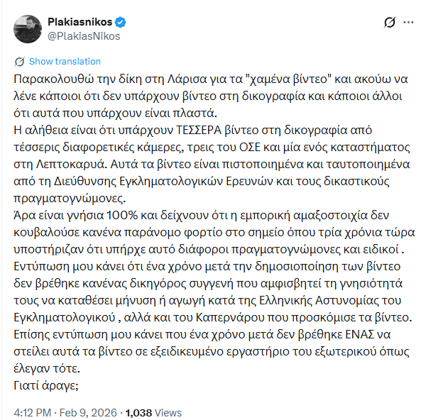 Σε ανάρτησή του μετά την έναρξη της δίκης στη Λάρισα για τα «χαμένα» βίντεο όπως ισχυρίστηκε η Μαρία Καρυστιανού, που σημαδεύτηκε και από ένταση, ο κ. Πλακιάς τονίζει χαρακτηριστικά: «Η αλήθεια είναι ότι υπάρχουν ΤΕΣΣΕΡΑ βίντεο στη δικογραφία από τέσσερις διαφορετικές κάμερες, τρεις του ΟΣΕ και μία ενός καταστήματος στη Λεπτοκαρυά. Αυτά τα βίντεο είναι πιστοποιημένα και ταυτοποιημένα από τη Διεύθυνσης Εγκληματολογικών Ερευνών και τους δικαστικούς πραγματογνώμονες.