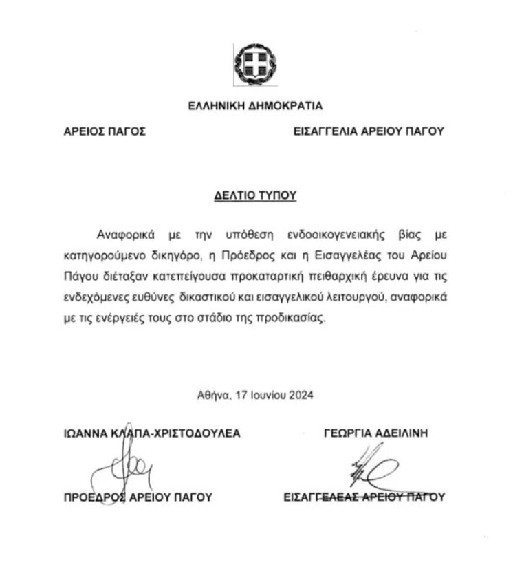 «Αναφορικά με την υπόθεση ενδοοικογενειακής βίας με κατηγορούμενο δικηγόρο, η Πρόεδρος και η Εισαγγελέας του Αρείου Πάγου, διέταξαν κατεπείγουσα προκαταρκτική πειθαρχική έρευνα για τις ενδεχόμενες ευθύνες δικαστικού και εισαγγελικού λειτουργού αναφορικά με τις ενέργειες τους στο στάδιο της προδικασίας».