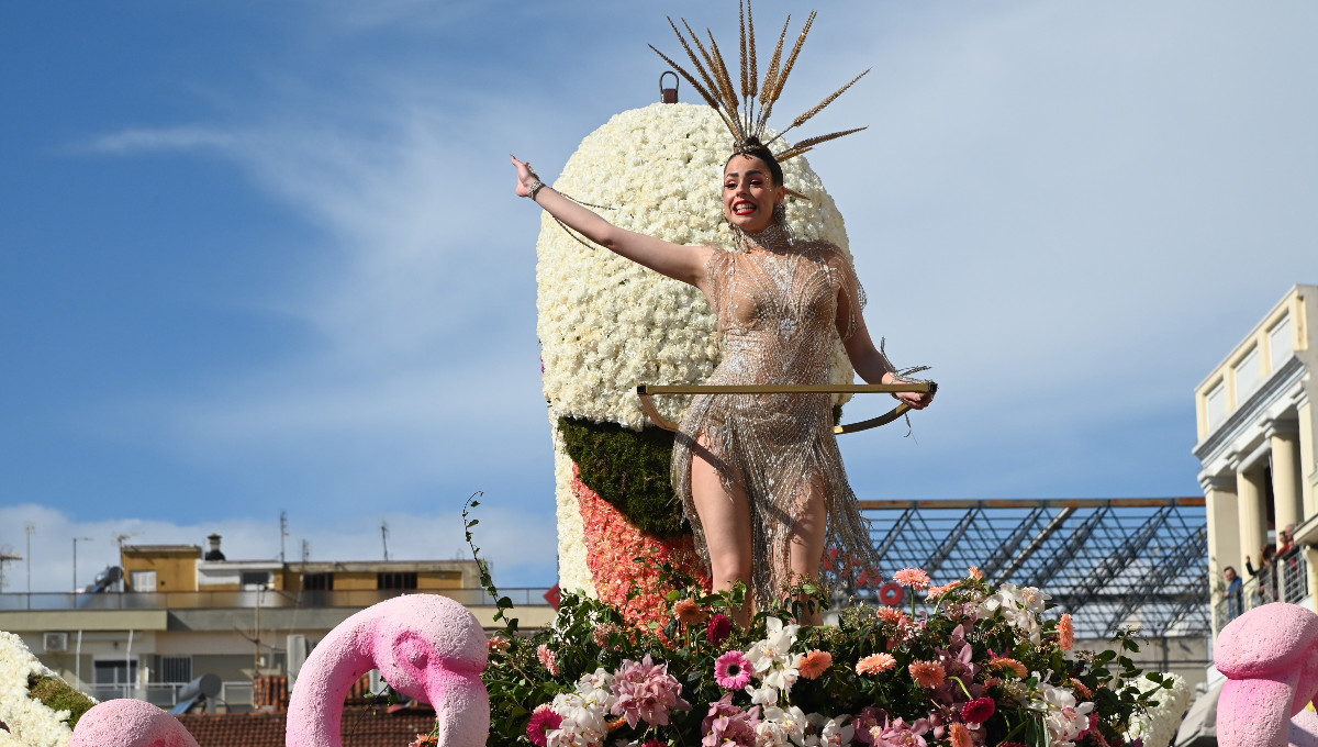 Στο άνθινο άρμα με τα 30.000 γαρίφαλα η βασίλισσα του καρναβαλιού, Μαρίζα Φλωράτου, έδινε χορεύοντας τον τόνο της διασκέδασης.
