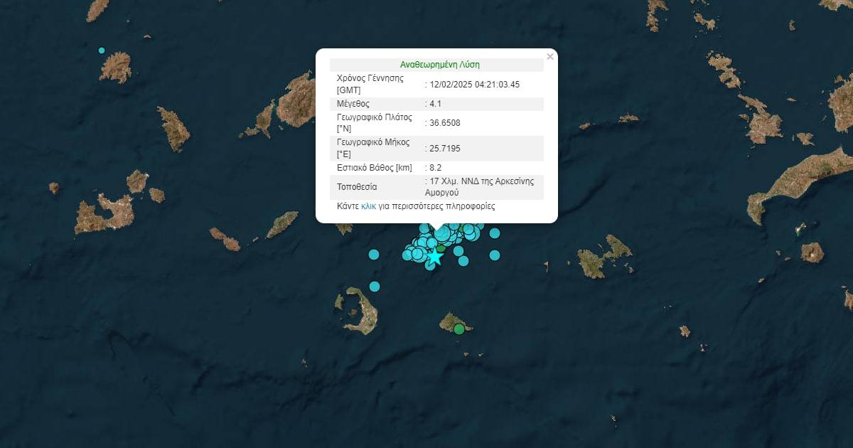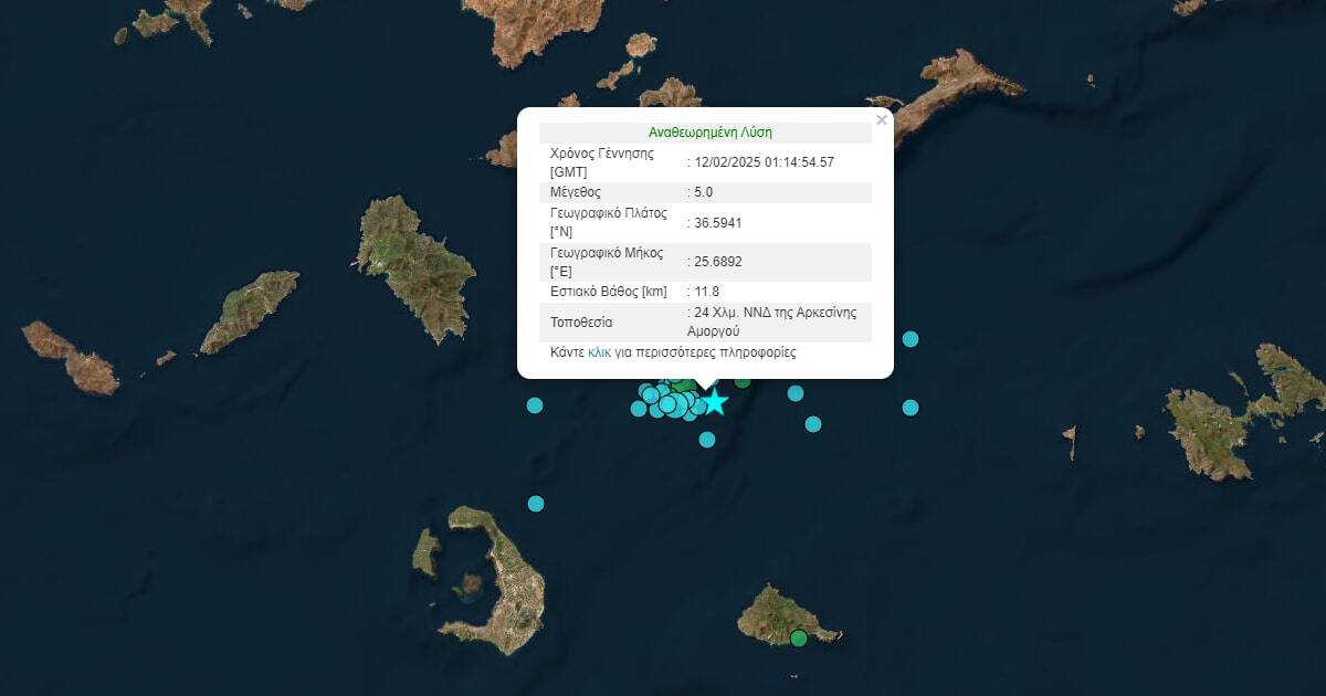 Νέα ισχυρή σεισμική δόνηση μεγέθους 5 βαθμών της κλίμακας Ρίχτερ σημειώθηκε στις 03:14 τα ξημερώματα της Τετάρτης στη θαλάσσια περιοχή μεταξύ Σαντορίνης και Αμοργού.