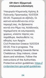 Νέο μήνυμα μέσω του 112 εστάλη στους κατοίκους της ευρύτερης περιοχής καλώντας όσους βρίσκονται κοντά στο Ρέμα της Χελιδονούς να παραμείνουν σε εσωτερικούς χώρους και να κλείσουν πόρτες και παράθυρα λόγω του καπνού. Ειδικότερα το μήνυμα αναφέρει: «Πυρκαγιά σε εξέλιξη. Οι καπνοί κατευθύνονται στην περιοχή σας. Αν βρίσκεστε κοντά στο Ρέμα της Χελιδονούς παραμείνετε σε εσωτερικούς χώρους, κλείστε πόρτες και παράθυρα . Ακολουθείτε τις οδηγίες των Αρχών »