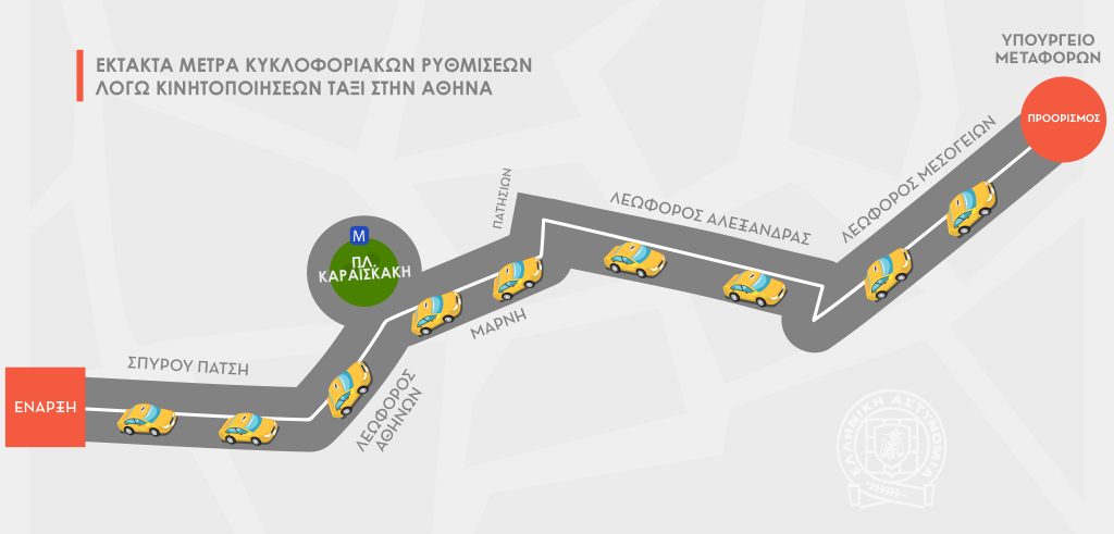 Σύμφωνα με νεότερη ενημέρωση από την Αστυνομία για την καλύτερη διαχείριση της κυκλοφορίας πραγματοποιούνται κυκλοφοριακές ρυθμίσεις κατά μήκος του δρομολογίου κίνησης (Σπ. Πάτση, λεωφόρο Αθηνών, Πλατεία Καραϊσκάκη, Μάρνη, Πατησίων, λεωφόρο Αλεξάνδρας και λεωφόρο Μεσογείων), που θα ακολουθήσουν οι οδηγοί ταξί μέχρι το υπουργείο Μεταφορών.