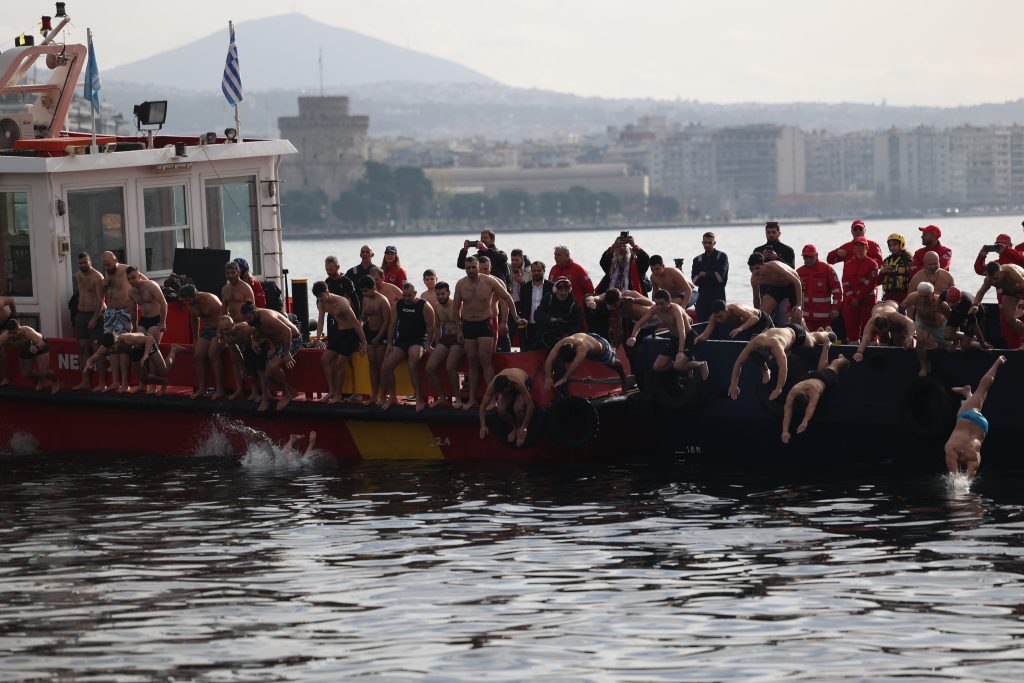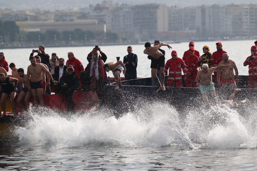 Με λαμπρότητα και παρουσία πλήθους πιστών πραγματοποιήθηκε το πρωί η τελετή καθαγιασμού των Υδάτων και ρίψης του Τιμίου Σταυρού στον Α’ προβλήτα του λιμανιού της Θεσσαλονίκης. Συνολικά 56 τολμηροί, όλων των ηλικιών, βούτηξαν από σκάφη στον Θερμαϊκό Κόλπο και τον σταυρό έπιασε ο 23χρονος, Στέργιος Παγωνίδης.