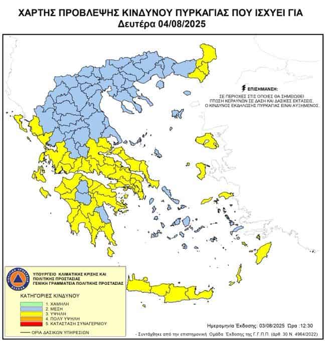 Υψηλός κίνδυνος πυρκαγιάς (κατηγορία κινδύνου 3) προβλέπεται για σήμερα Δευτέρα 4 Αυγούστου σε αρκετές περιοχές της χώρας, σύμφωνα με τον Χάρτη Πρόβλεψης Κινδύνου Πυρκαγιάς που εκδίδει η γενική γραμματεία Πολιτικής Προστασίας του υπουργείου Κλιματικής Κρίσης & Πολιτικής Προστασίας.