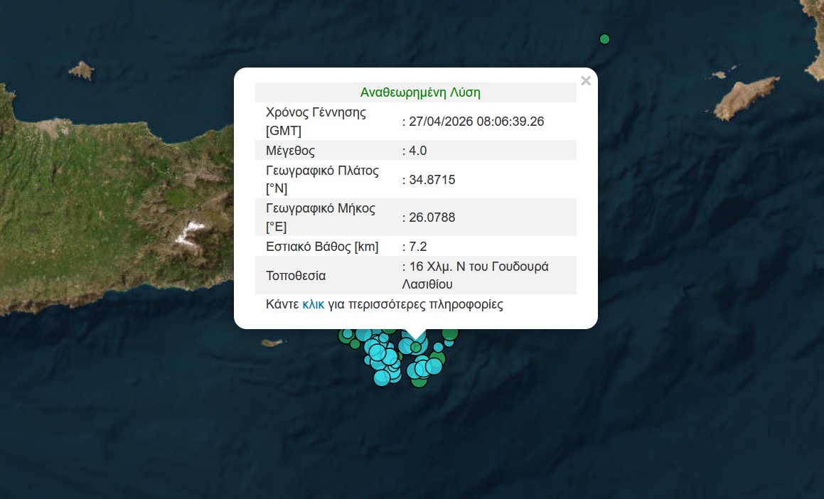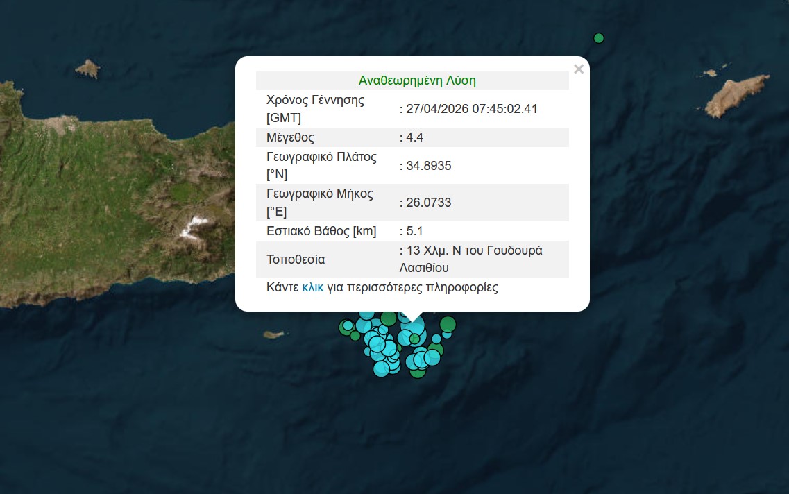 Ο Εγκέλαδος συνεχίζει να ταρακουνάει την Κρήτη και μάλιστα πριν από λίγο σήμερα (27.4.2026) έγιναν δυο σεισμοί αρχικά 4,4 Ρίχτερ και 4 Ρϊχτερ λίγο μετά σε θαλάσσια περιοχή στον Γουδαρά Λασιθίου.