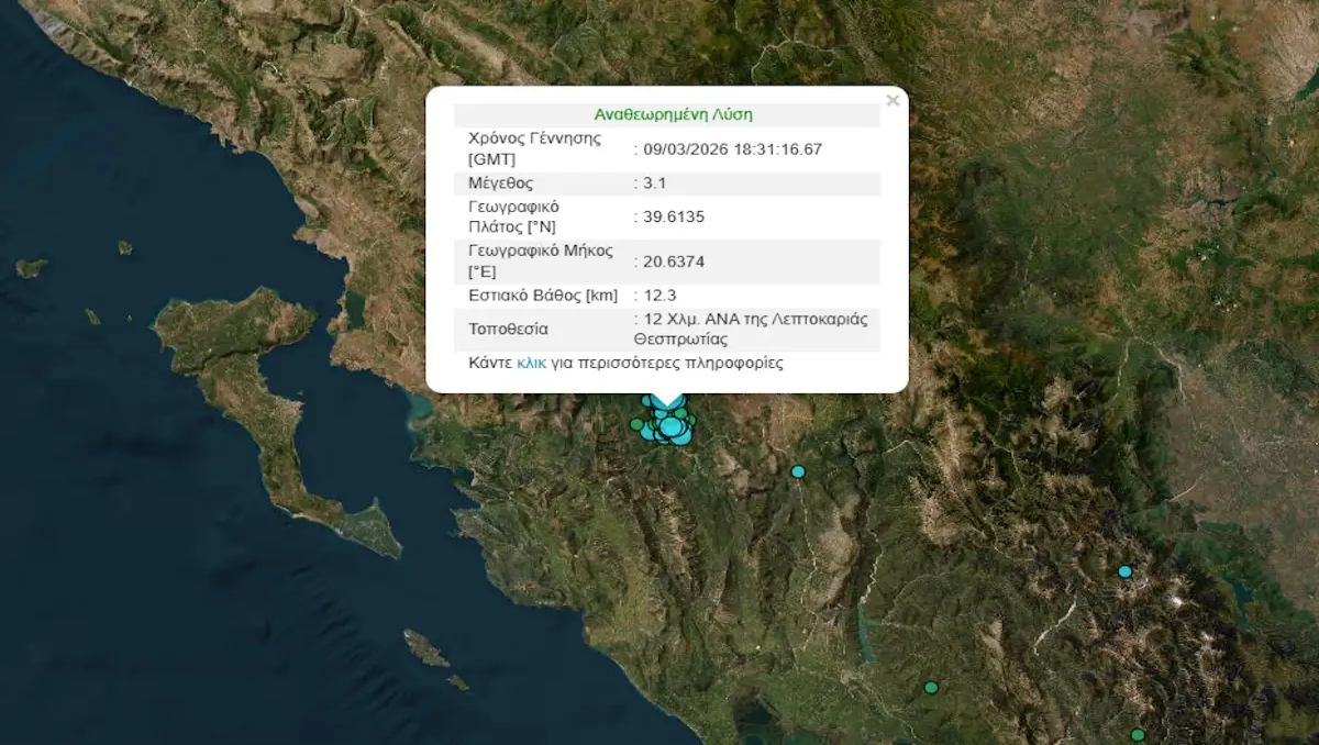 Η γη συνεχίζει να σείεται στη Θεσπρωτία μετά τον σεισμό των 5,3 Ρίχτερ της 8ης Μαρτίου και μια νέα σεισμική δόνηση, αυτή τη φορά της τάξης των 3,1 βαθμών της κλίμακας Ρίχτερ, έγινε αισθήτή σήμερα (9.3.2026) το βράδυ στην περιοχή.
