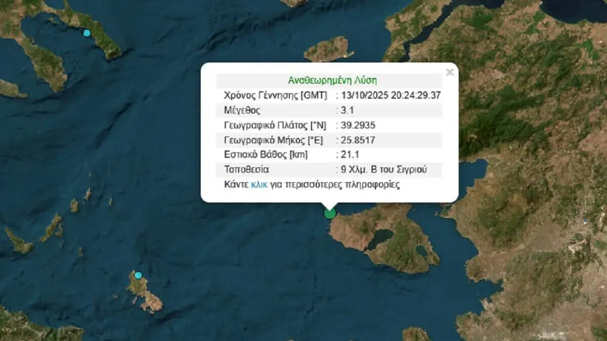 Ο σεισμός στη Λέσβο είχε εστιακό βάθος 21,1 χιλιόμετρα και είχε επίκεντρο εννιά χιλιόμετρα βόρεια του Σιγριού.