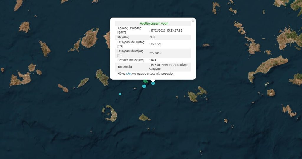 Η σεισμική δόνηση είχε επίκεντρο τη θαλάσσια περιοχή που βρίσκεται σε απόσταση 15 χιλιομέτρων νότια-νοτιοανατολικά της Αμοργού.