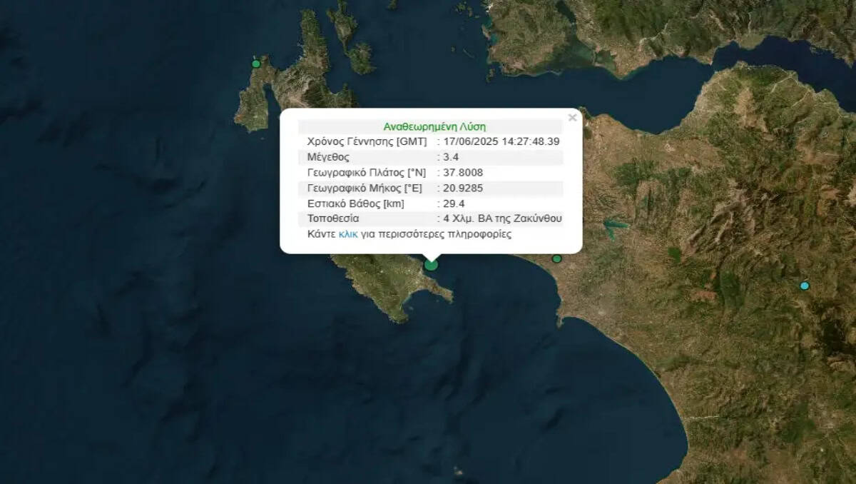 Σεισμός μεγέθους 3,4 Ρίχτερ σημειώθηκε το απόγευμα της Τρίτης (17.06.2025) στη Ζάκυνθο.