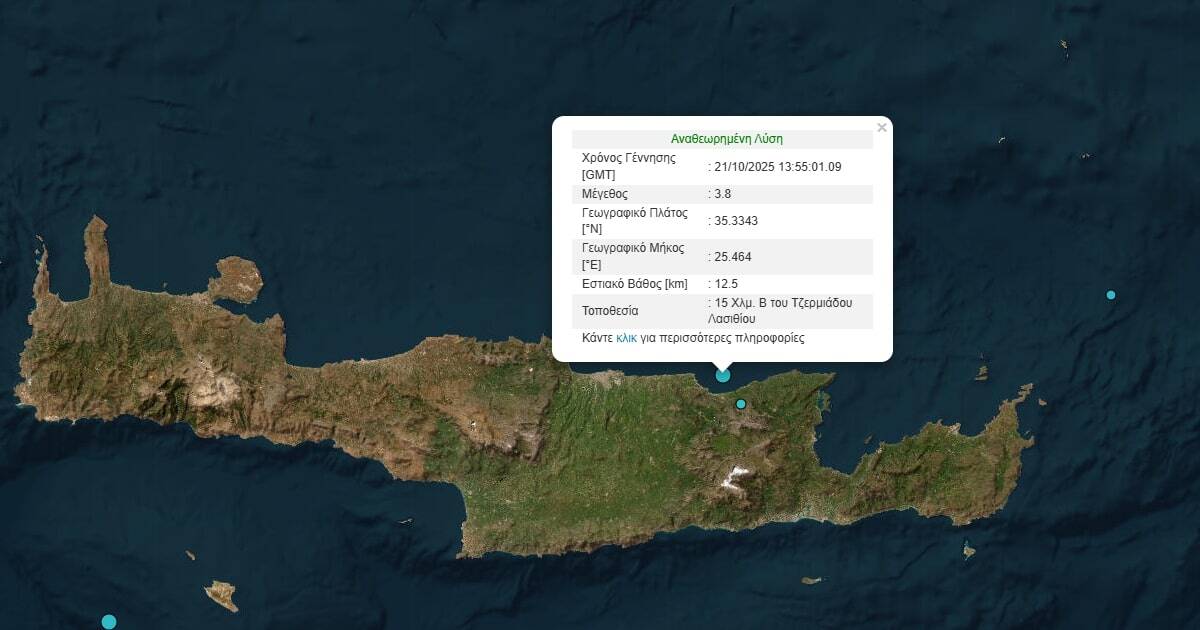 Σεισμός μεγέθους 3,8 βαθμών της κλίμακας Ρίχτερ σημειώθηκε 15 χλμ. βόρεια του Τζερμιάδου Λασιθίου.