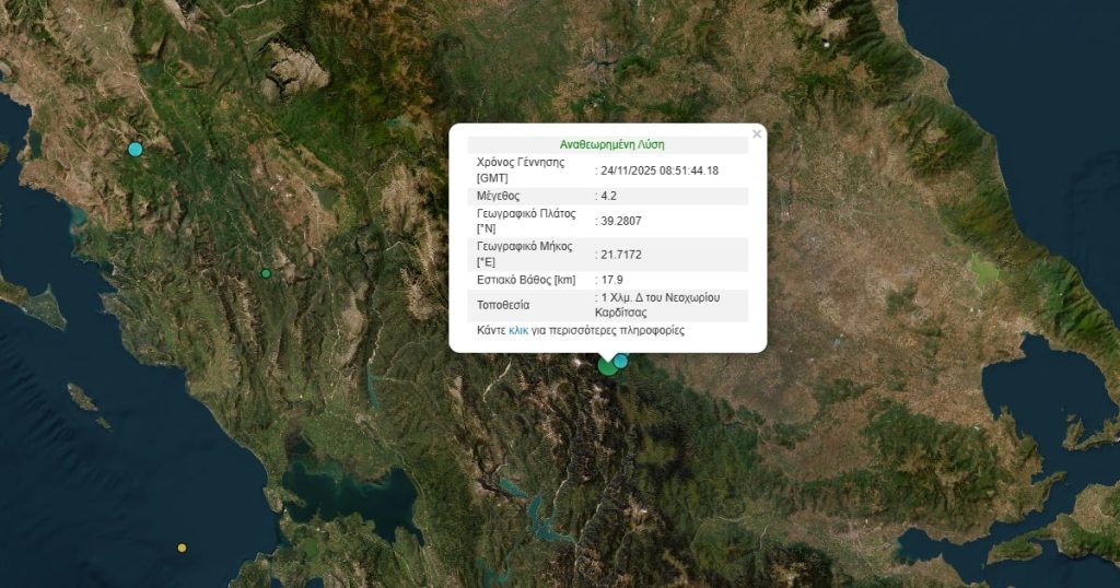 Σεισμική δόνηση μεγέθους 4,2 βαθμών της κλίμακας Ρίχτερ σημειώθηκε το πρωί της Δευτέρας στην Καρδίτσα.