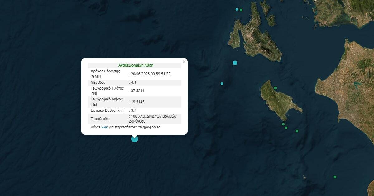 Σεισμός 4,1 βαθμών της κλίμακας Ρίχτερ σημειώθηκε στις 06:59, σε απόσταση 373 χλμ. δυτικά της Αθήνας.